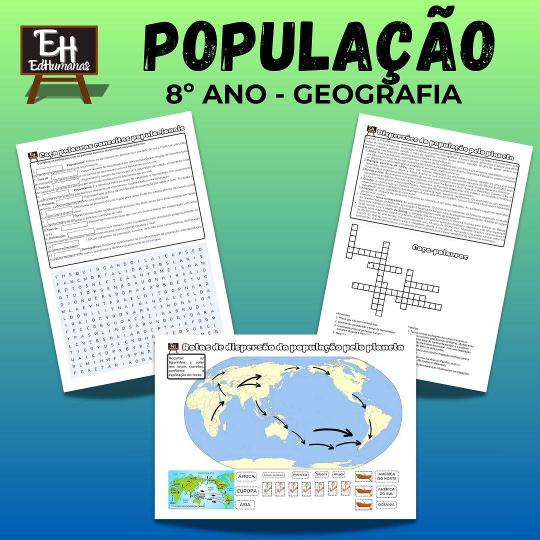 Kit população – Geografia 8º ano com infográfico interativo das rotas de dispersão da população pelo mundo, textos, palavra cruzada e caça palavras sobre os conceitos fundamentas da demografia na geografia.